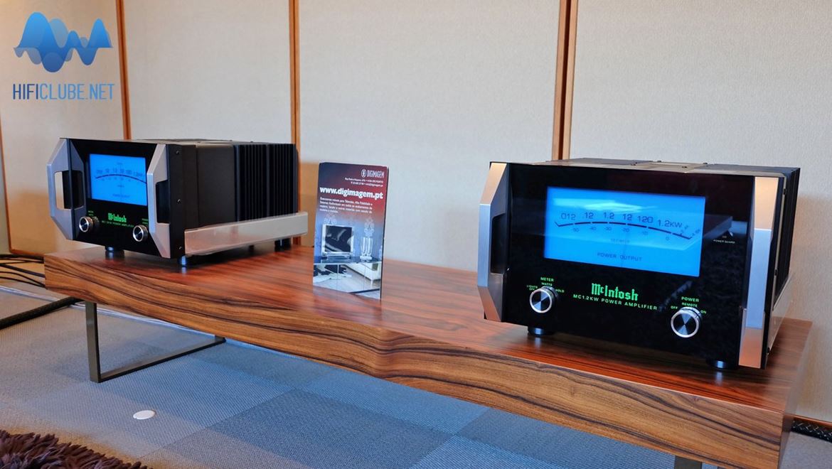 McIntosh CD/SACD MCD 1100, Prévio a válvulas/Controller C500, monoblocos 1,2KW e as colunas KRT1K , tudo montado a preceito no auditório da Digimagem, com um mínimo de tratamento acústico, e nem sequer um cortinado a proteger a enorme vidraça da montra.