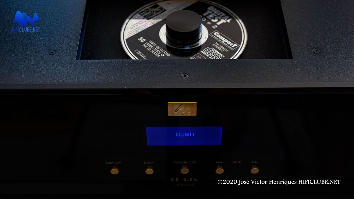 O transporte, que assenta sobre uma suspensão de 4-molas, é de ‘carregar por cima’, colocando-se depois um estabilizador magnético sobre o disco, e tem o mínimo de funções necessárias para reproduzir os CD: Play/Pause, Stop, Skip, todas acessíveis por controlo remoto ou pequenos botões dourados de pressão. E ainda Display, para reduzir/desligar a luminosidade do mostrador OLED em azul elétrico. Eject não há: abre-se a gaveta à mão, fazendo deslizar a tampa, e muda-se o disco…